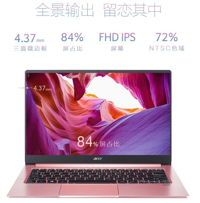 宏碁新蜂鸟14笔记本采用了IPS高清屏幕设计,72%NTSC高色域,拥有三面微边框,屏占比高达84%,从综合素质来看,新蜂鸟14笔记本的整个屏幕表现的还是很棒的,窄边框给了用户更大的视觉感受,也顺应了轻薄本设计的主流,更宽的视野更加利于办公当中的左右屏幕协同工作。