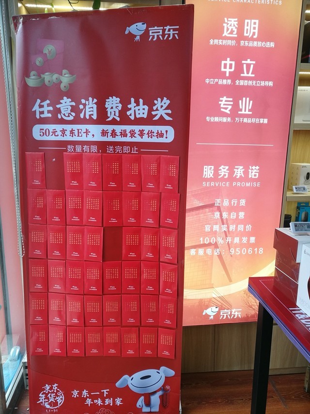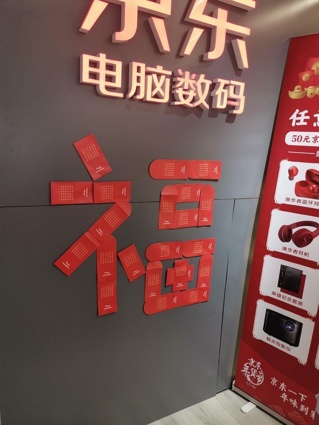 在京东电脑数码专卖店,为新年打造的专属红包墙成为最吸引消费者的集中打卡地。用新年红包贴成“福”字的字样,不仅将财运送到消费者身边,更是将新年的好福气分发到每个人手中。