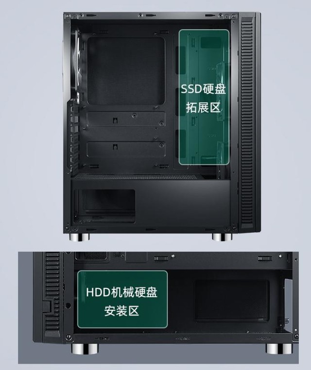 机箱宽大,340*200*400mm的机体,兼容ATX/MATX/ITX主板,随意装,装配随心。多达7个PCI扩展槽,让你发挥自如;显卡限长320mm,CPU散热限高154mm,此外支持SSD固态硬盘扩展,同步支持HDD机械硬盘(8-9cm)散热风扇安装。整体设计可圈可点。