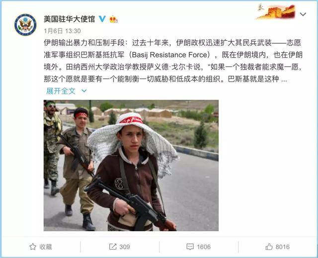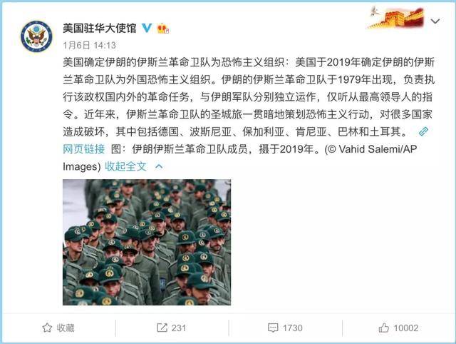 这一天,美国驻华大使馆发了两条微博,声称伊朗“输出暴力和压制手段”,并强调“美国已确定伊朗伊斯兰革命卫队为恐怖主义组织”。