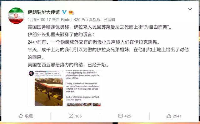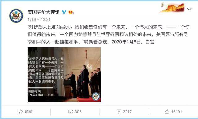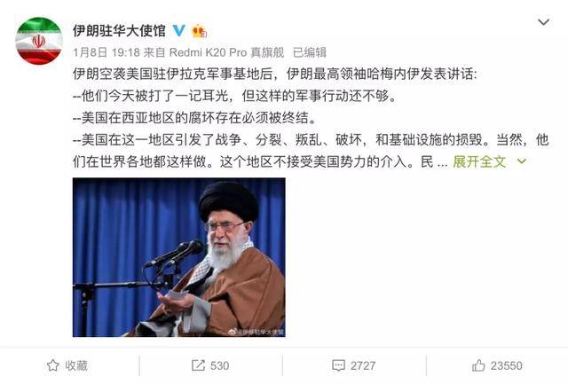 袭击美军基地后 伊朗驻华大使馆一条微博上热搜