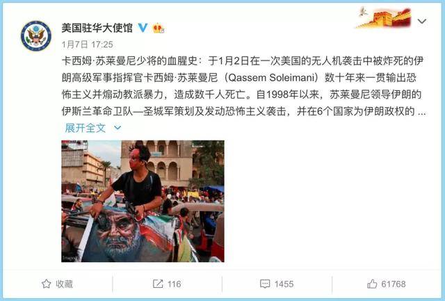 之后不久,美国驻华大使馆在一个小时内连发三条微博,并在文中引用了美国国务卿蓬佩奥的话,声称消灭苏莱马尼是为了保护海外美国人的“决定性防御行动”。