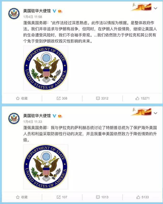 其实,伊朗驻华大使馆和美国驻华大使馆在微博上的隔空“掐架”,从1月3日美国将3枚火箭弹投向巴格达国际机场后不久就开始了。回看和梳理两个账号最近发布的内容可以发现,两国驻华使馆的隔空“掐架”大概分为这几轮——