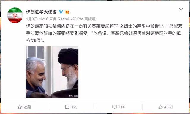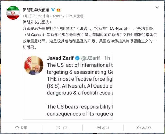 事发后,伊朗驻华大使馆迅速发布了两条微博,分别引用伊朗最高领袖哈梅内伊和外长扎里夫的话,警告美国将遭到“报复”。