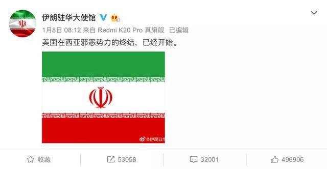 8日上午,也就是伊朗袭击美军基地后不久,伊朗驻华大使馆在官方微博上晒出国旗,并配文“美国在西亚邪恶势力的终结,已经开始”。截至昨晚,这条微博点赞数已达近50万。