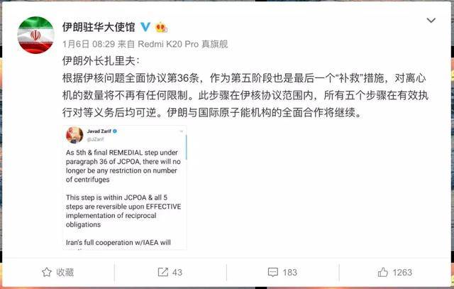 北京时间6日早上,伊朗驻华大使馆转发伊朗外长扎里夫的社交媒体账号内容,宣布不再限制离心机数量。