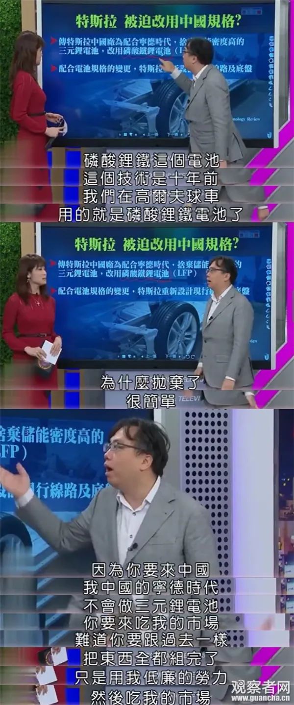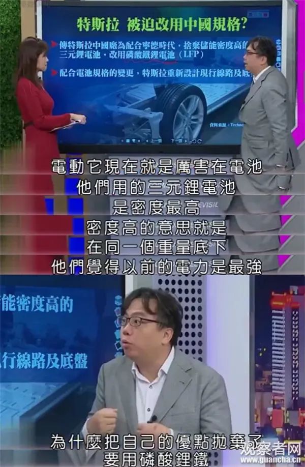 节目中,这位“台湾专家”庄正贤表示,美国电动车企特斯拉的优势就在于其采装载的三元锂电池。相比于其他电池,三元锂电池具有密度较高的优点,其电力也是最强的。