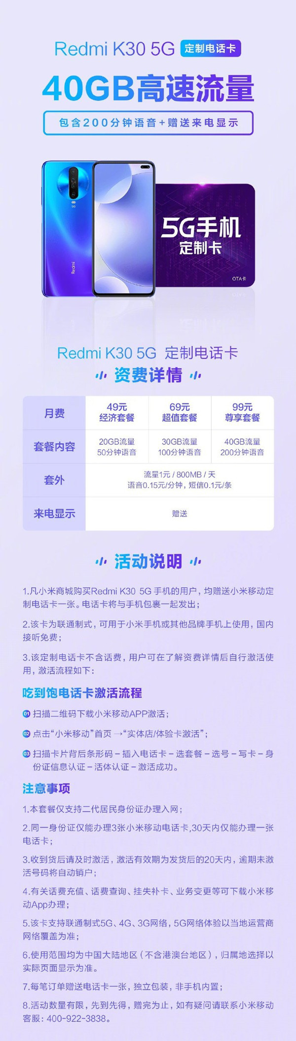 小米5G手机定制卡上线:49元起 买Redmi K30 5G就送!