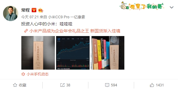 与此同时,常程转发了一篇名为《小米产品成为企业年会礼品之王 新国货渐入佳境》的文章。文章称,一个有意思的新变化正在悄然发生。2020年各大公司年会上,小米系列智能产品和苹果产品成为新的年会礼品之王。
