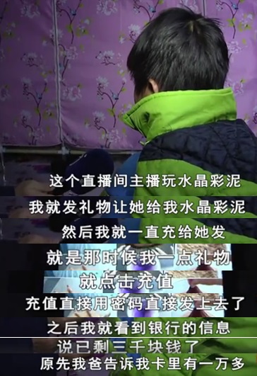 据黄女士介绍,自己也是听朋友说才知道有人用自己丈夫的账号给主播打赏了一万多块钱,她赶回家一看,手机在儿子的身边。而据黄女士儿子小海介绍,自己在看主播直播玩水晶彩泥时希望自己也能够得到水晶彩泥,主播说刷礼物就送就给水晶彩泥,他就几百块几百块的送。家里卖粮的一万多都给打赏了。